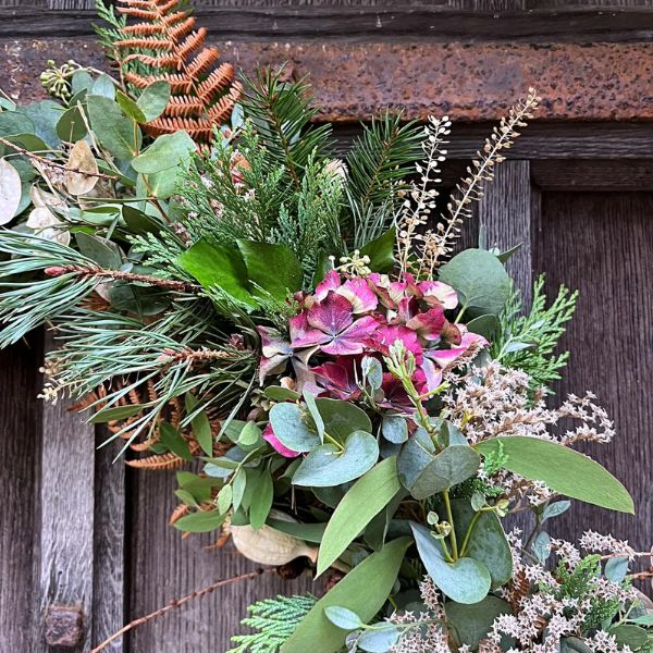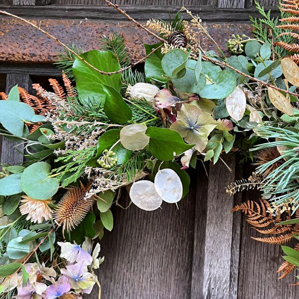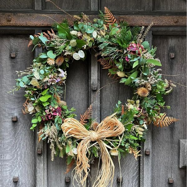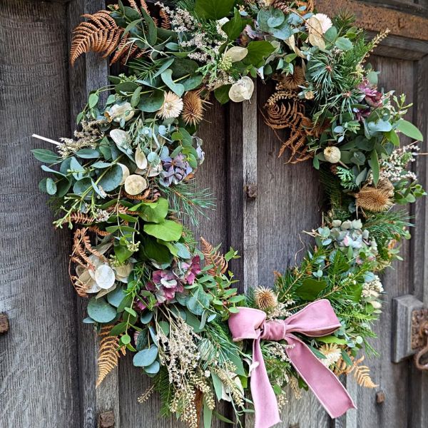 Our premium Fir, eucalyptus and dried flower wreath combines delicate dried flowers, autumnal bracken from the moor with eucalyptus and traditional Christmas foliage for an intricate and delicate wreath that looks great at both 10 inch and a large 20" showstopper! Every wreath is handmade and unique using beautiful foliage and berries sourced in Devon. The wreath is made from a mix of seasonal foliage with most elements picked from my garden or sustainably foraged. Wreaths can be adjusted to individual requirements upon request.